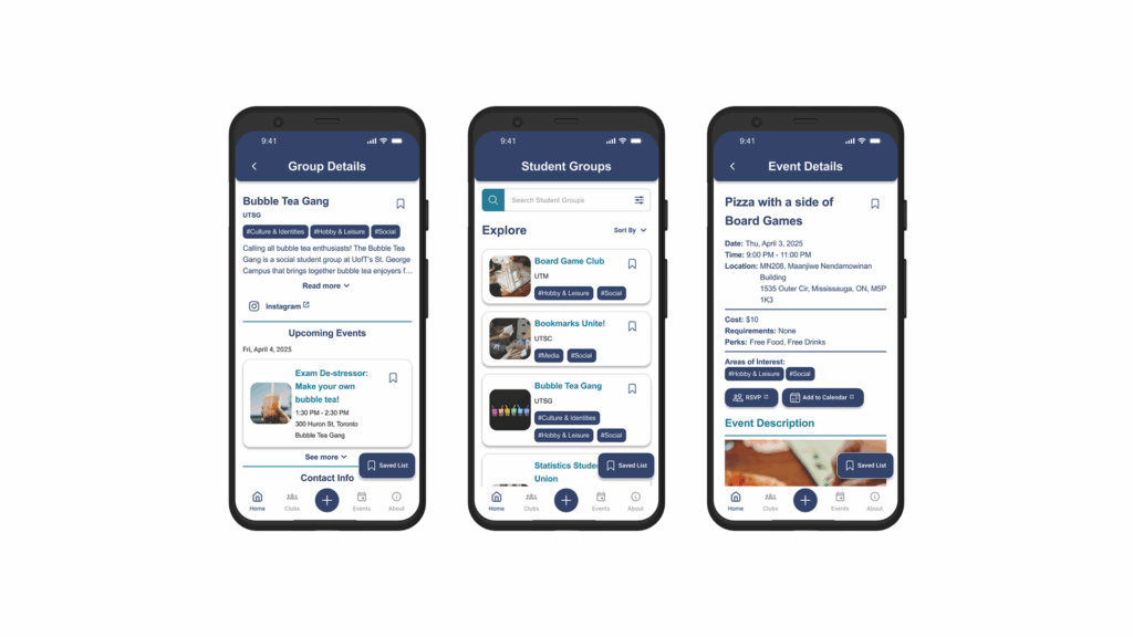 Working with the UofT MADLabs team, my team and I created an accessible mobile application design to facilitate student interactions with student clubs and organizations.