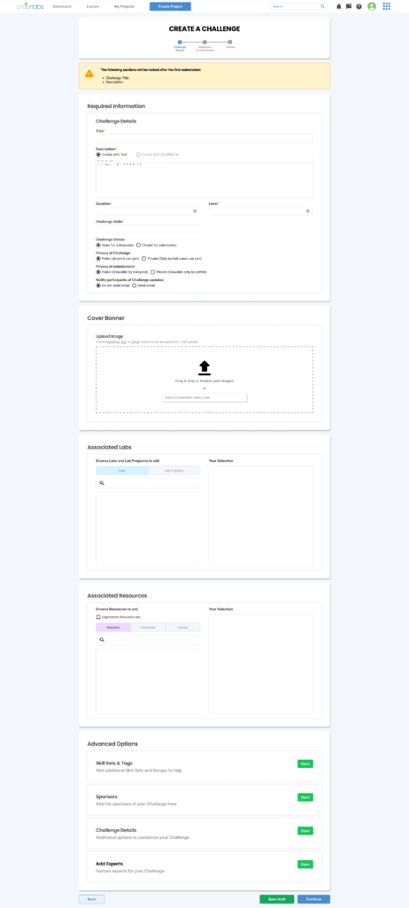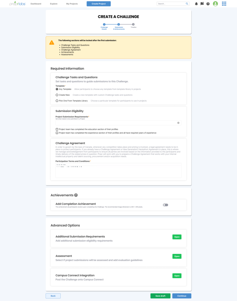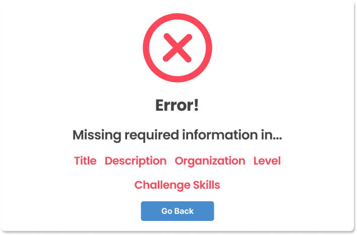If the instructor were to leave the Challenge creation or editing page with unsaved changes, they will now get a pop-up that warns them about unsaved changes. This way, we can help prevent accidents from happening that would result in the instructor losing their work. Additionally, if an instructor tries to proceed with the next step without filling in the required information section, they will receive an alert pop-up letting them know which fields they still need to fill out before proceeding.