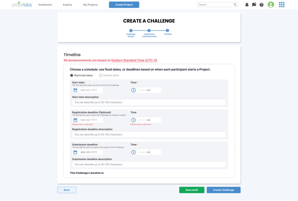 Lastly, the third step covers when the Challenge will be released and for what duration. Instructors can set it up to release the Challenge on a specific date and when the deadline is. They can either set the specific dates or list a number of days for the Challenge to allow submissions.