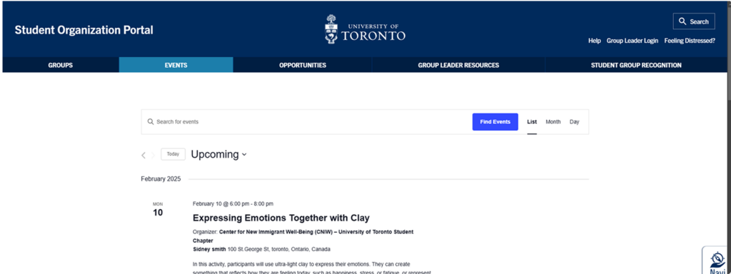 Another part of this research was reviewing already existing practices for event management and promotion used by UofT clubs. At the time of research, students only had a few limited ways of discovering clubs and events. Other than monthly newsletters and social media, there is a Student Organization Portal. However, the portal is infrequently updated and does not properly reflect all potential events happening on campus.